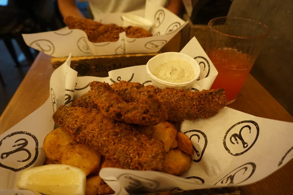 Bia Mara, Bruksela – street foodowa knajpka w centrum Brukseli przyciąga amatorów owoców morza, którzy czekają w kolejce na zwolnienie się stolika w niewielkim lokalu. Nie zjecie tutaj nic, poza darami morza. Świeże rybki w panko lub tempurze, pieczone frytki, oryginalne sosy, orzeźwiające lemoniady. Porcje są tak sycące, że ledwo zmęczyliśmy te widoczne na zdjęciu. Zaletą są ceny, bo są jedne z najniższych w Brukseli. Wszystkie danie kosztują 12-13 euro. Są też opcje wegańskie. Za taką jakość, smak i ilość? Warto!