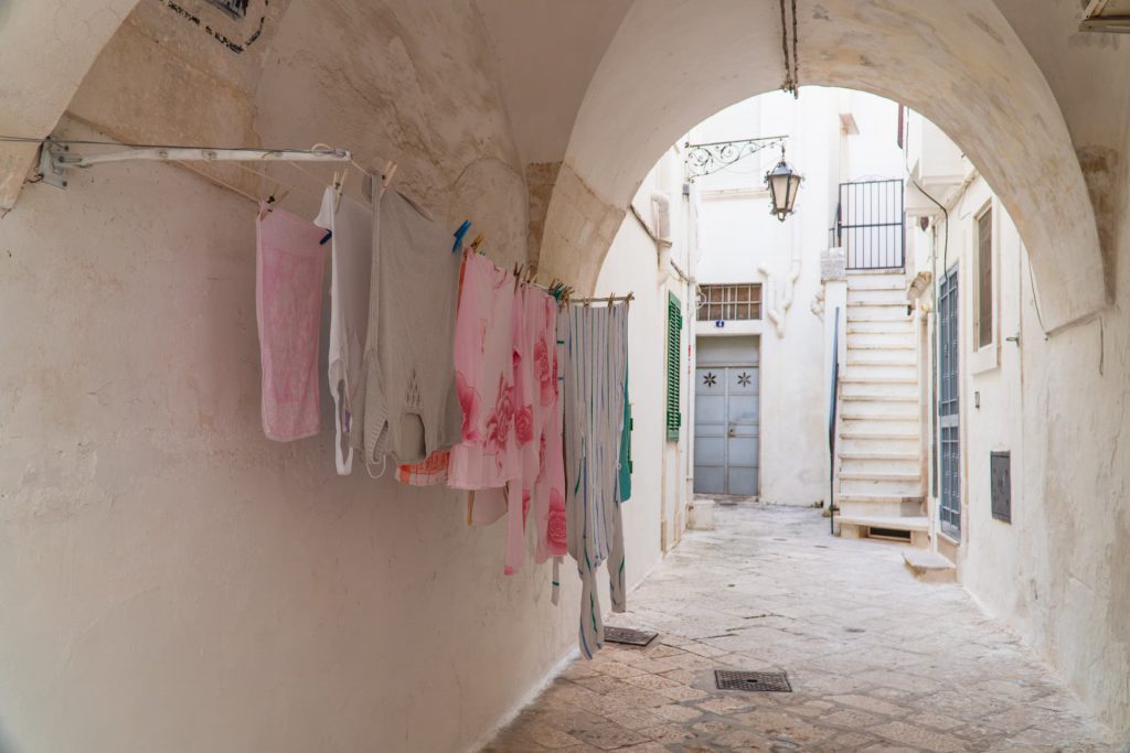 A przy tym, że Martina Franca jest wyrafinowana i elegancka, to wciąż posotaje tak… włoska. I spokojna. Labirynt przepięknych, białych ulic aż prosi się o to, by zgubić się w nim i nie wyciągać mapy. Wspaniale przystrojone ulice zaskakują na każdym kroku. Na tych ulicach wciąz toczy się zwykłe życie – sąsiad rozmawia z sąsiadem, starsza kobieta podlewa kwiat, dzieci grają w piłkę, ludzie wracają z zakupami, parkują swoje skutery w zaułkach. Z wnętrz budynków dobiegają nas dźwięki nieraz gwałtownych rozmów, a naszych nozdrzy zapach prania wymieszany z wonią jedzenia. Co jakiś czas biją kościelne dzwony, trąbią klaksony, a z barów słychać szum ekspresu do kawy. Można się w tym miejscu zatracić. Chociaż na początku zauroczeni przepięknymi ulicami miasta, biegaliśmy po każdej możliwej uliczce, w pewnym momencie po prostu usiedliśmy w jednej z kawiarni na Piazza Plebiscyto i cieszyliśmy uszy dźwiękami, nosy zapachami, a oczy tym olśniewającym apulijskim barokiem.